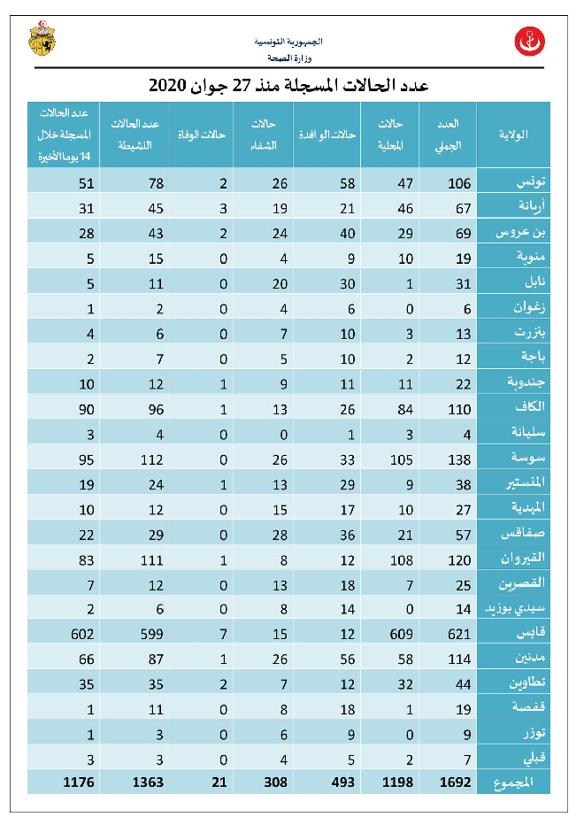 Depuis l’ouverture des frontières le 27 juin 2020, 1692 cas confirmés de coronavirus ont été enregistrés, dont 493 arrivants et 1198 cas locaux (70,8 et 21 Décès (% 1,2).