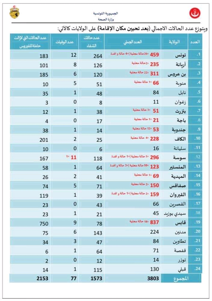 Bilan du Covid-19 en Tunisie (au 31 août) : 109 nouveaux cas portant le total à 3803 contaminations confirmés (détails)