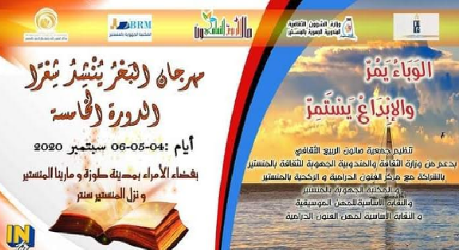 Tunisie-Tribune (la mer récitant de la poésie à Monastir) – L’Association « Salon du printemps culturel » organise la cinquième édition du Festival « la mer récitant de la poésie à Monastir » les 04, 05 et 06 septembre 2020, sous le slogan « L’épidémie passe et la créativité continue « .