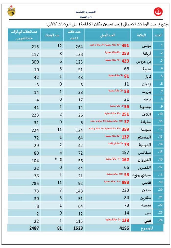 Bilan du Covid-19 en Tunisie (au 2 septembre) : 233 nouveaux cas portant le total à 4196 contaminations confirmés (détails)