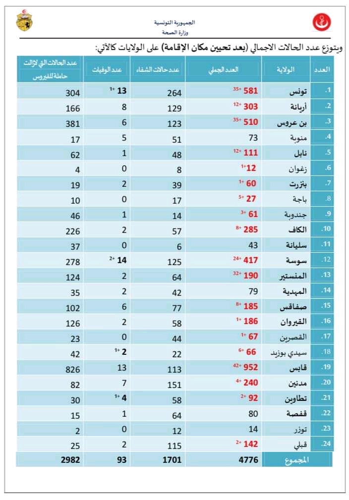 Les régions qui ont enregistré le plus grand nombre de contaminations sont Gabès (42), Tunis (35), Ben Arous (35), Monastir (32) et Sousse (24).