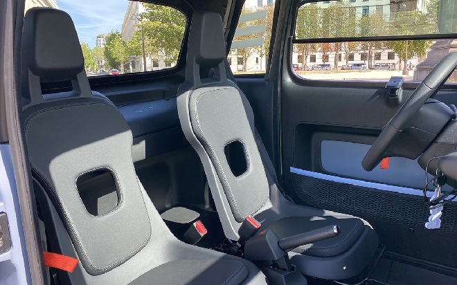Il est temps de prendre le volant pour une balade dans les rues de la capitale. Comme on le disait plus haut, l’espace offert par l’habitacle est assez étonnant eut égard à la taille de la Citroën AMI. De plus, le pare-brise semble positionné loin devant le conducteur renforçant d’autant la sensation d’espace. Les sièges sont relativement confortables bien qu’ils ne soient pas inclinables. Quoiqu’il en soit, il est peu probable de rester assis dessus toute la journée et on s’en contente aisément.