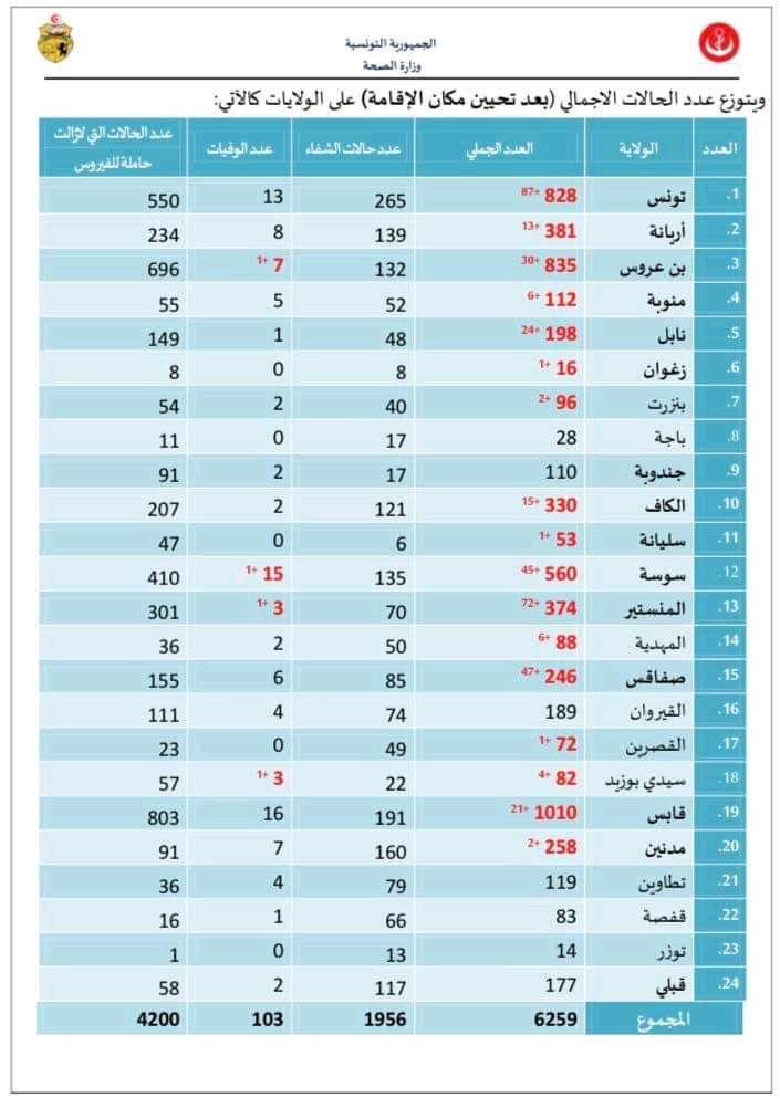 Bilan du Covid-19 en Tunisie (au 11 septembre) : 377 nouveaux cas portant le total à 6259 contaminations confirmés (détails)