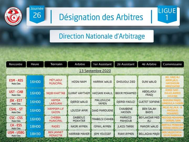 Tunisie-Tribune (Programme des matchs et arbitres) – La direction nationale d’arbitrage a publié ce vendredi 11 septembre 2020 la désignation des arbitres de la dernière journée du championnat de Ligue 1.