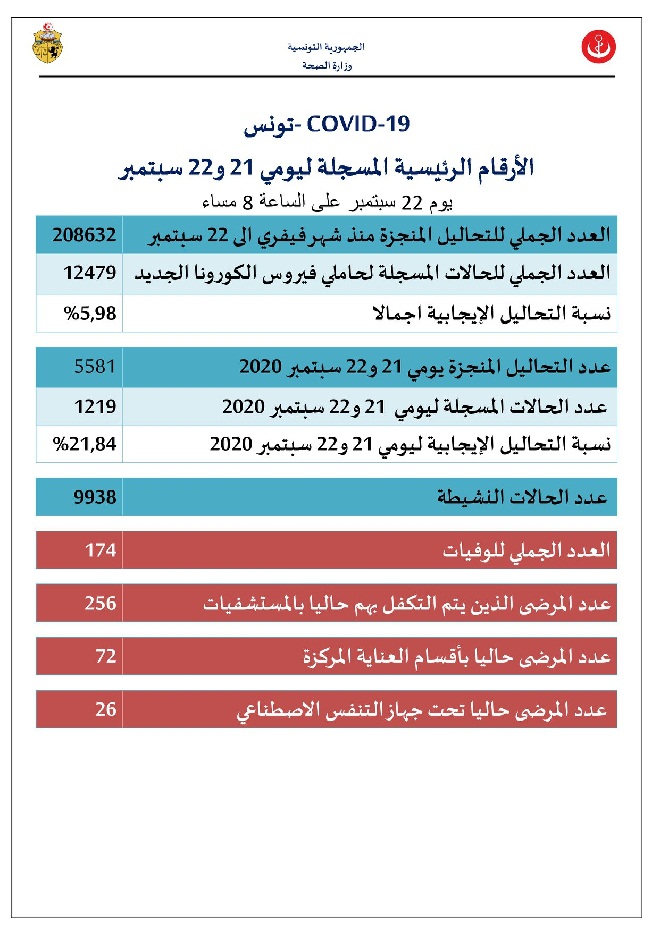 Tunisie-Tribune (Bilan du Covid-19 en Tunisie) – La directrice de l’Observatoire national des maladies nouvelles et émergentes, Nissaf Ben Alaya, a déclaré, lors d’une conférence de presse tenue ce mercredi 22 septembre, que 1219 nouvelles contaminations ont été enregistrées en Tunisie entre le 20 et 21 septembre 2020.