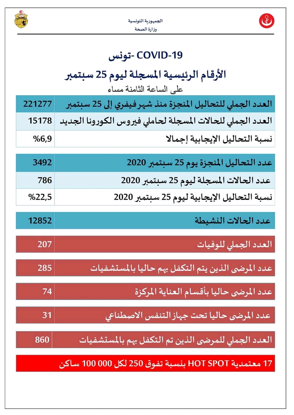 Tunisie-Tribune (Bilan du Covid-19 en Tunisie) –Le ministère de la Santé a annoncé dans un communiqué publié aujourd’hui dimanche 27 septembre 2020, 786 nouveaux cas de contamination ont été enregistrés.