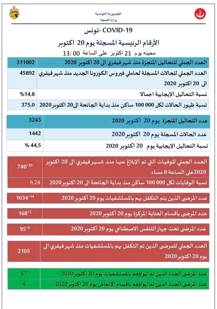 Bilan du Covid-19 en Tunisie (au 21 octobre) : 1442 nouveaux cas portant le total à 45892 contaminations confirmés (détails)