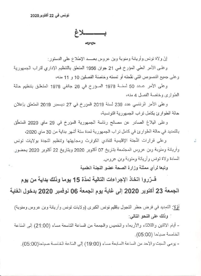 Tunisie-Tribune (Prolongation du couvre-feu) – Suite à une réunion tenue entre les quatre gouverneurs du grand Tunis, il a été décidé de prolonger le couvre-feu jusqu’au 6 novembre prochain à Tunis, Ben Arous, la Manouba et Ariana . Le couvre-feu s’étalera de 21h00 jusqu’à 5h00, du lundi au vendredi alors que le week-end, il s’étalera de 19h00 jusqu’à 5h00.