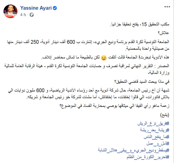 Cette annonce intervient après que Yassine Ayari a publié sur son compte Facebook qu’une enquête pénale a été ouverte sur une affaire d’achat de médicaments d’une valeur de 600 mille dinars par la fédération tunisienne de football sans facture à l’appui. Une bonne partie de ces médicaments a été acquise auprès d’une seule pharmacie à Mhamdia.