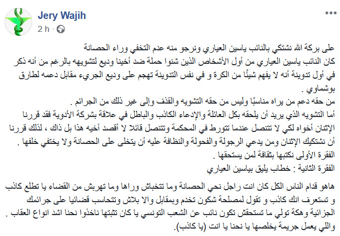 Tunisie-Tribune (Waddii Katy) – Wajih Jary, frère du président de la fédération tunisienne de football, Wadii Jary, a annoncé via son compte Facebook qu’il a décidé, avec son deuxième frère, de porter plainte à l’encontre du député indépendant Yassine Ayari pour diffamation et fausses allégations.