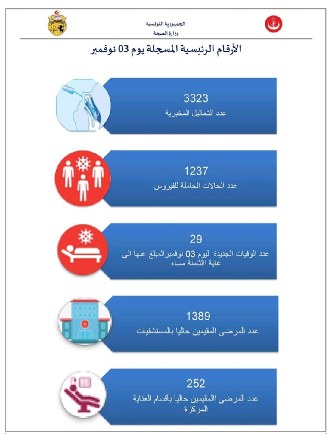 Tunisie-Tribune (Bilan du Covid-19 en Tunisie) – Le ministère de la Santé a annoncé, dans un communiqué publié ce matin, mercredi 4 novembre 2020, qu’à la date du 3 novembre 2020, 1237 cas de coronavirus ont été enregistrés dans le pays.