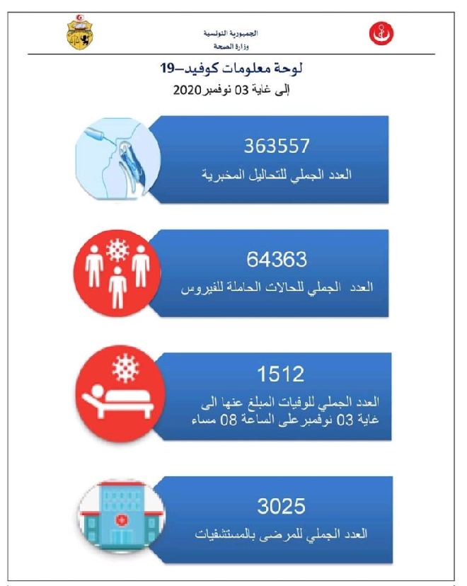 Bilan du Covid-19 en Tunisie (au 4 novembre) : 1237 nouveaux cas portant le total à 64363 contaminations confirmés (détails)