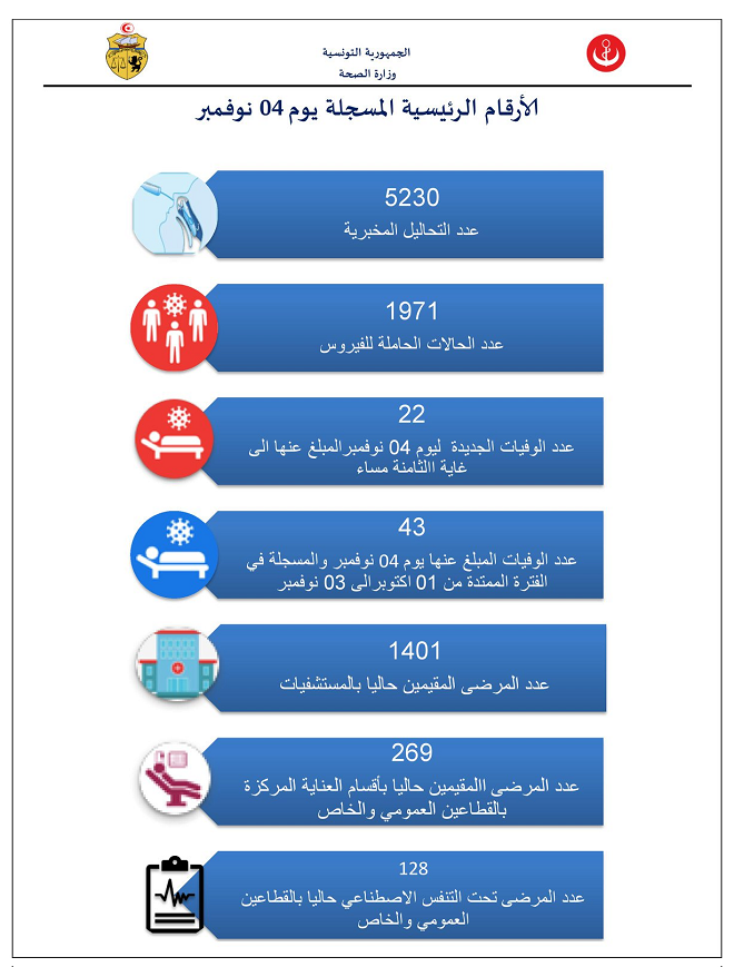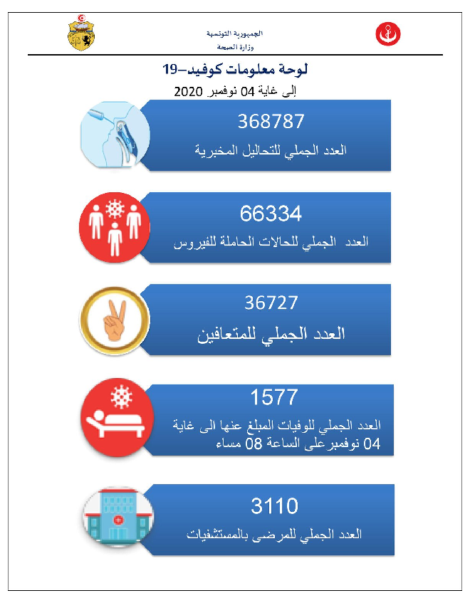 Tunisie-Tribune (Bilan du Covid-19 en Tunisie) – Le ministère de la Santé a annoncé, dans un communiqué publié ce matin, jeudi 5 novembre 2020, qu’à la date du 4novembre 2020, 1971 cas de coronavirus ont été enregistrés dans le pays.