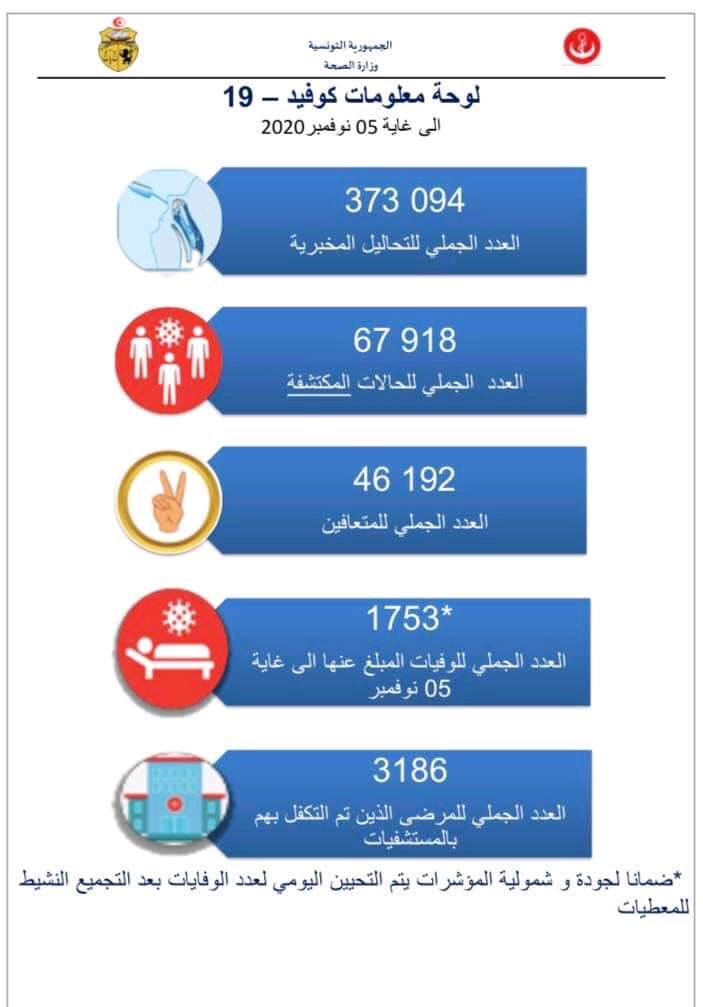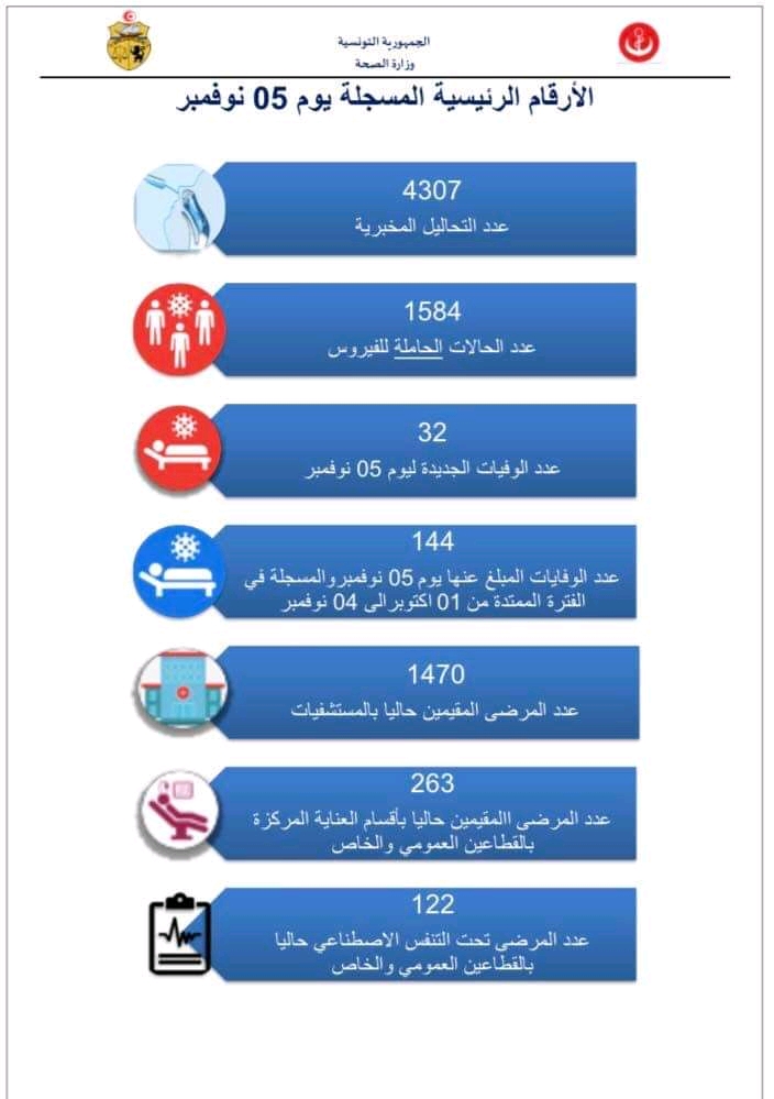 Tunisie-Tribune (Bilan du Covid-19 en Tunisie) – Le ministère de la Santé a annoncé, dans un communiqué publié ce matin, samedi 7 novembre 2020, qu’à la date du 5 ovembre 2020, 1584 cas de coronavirus ont été enregistrés dans le pays.