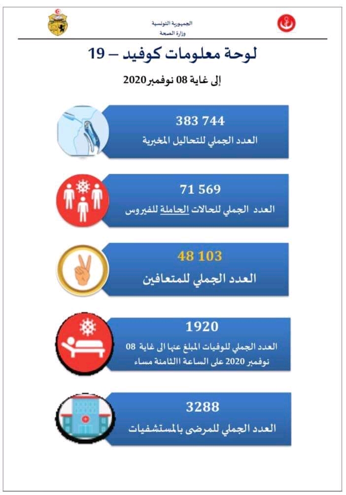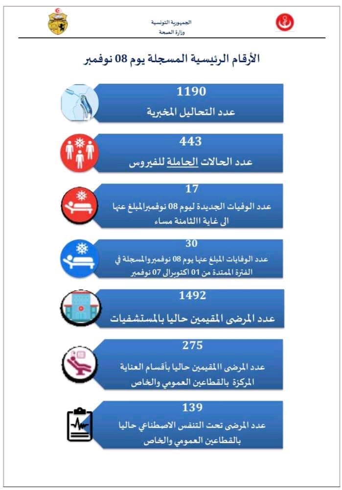 Tunisie-Tribune (Bilan du Covid-19 en Tunisie) – Le ministère de la Santé a annoncé, dans un communiqué publié aujourd’hui lundi 9 novembre 2020, qu’à la date du 8 novembre 2020, 443 cas de coronavirus ont été enregistrés dans le pays.