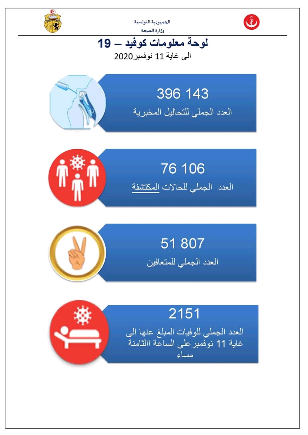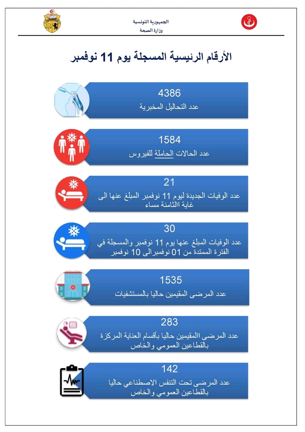 Tunisie-Tribune (Bilan du Covid-19 en Tunisie) – Le ministère de la Santé a annoncé, dans un communiqué publié aujourd’hui jeudi 12 novembre 2020, qu’à la date du 11 novembre 2020, 1584 cas de coronavirus ont été enregistrés dans le pays.