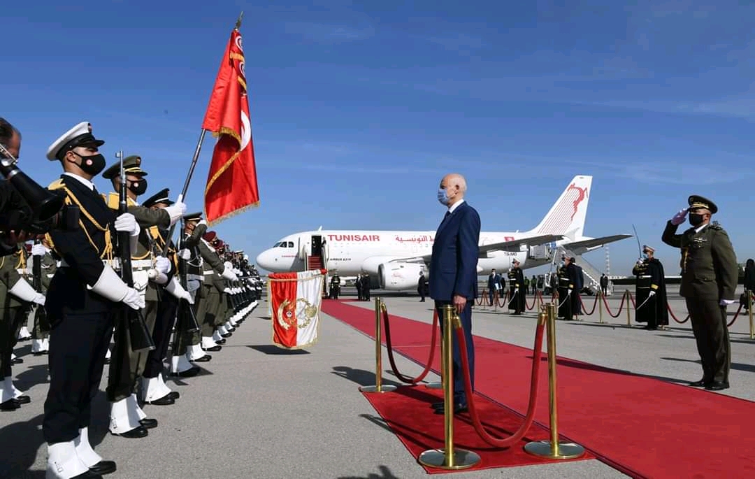 A son arrivée à l’aéroport Tunis-Carthage, le chef de l’Etat a salué le drapeau au son de l’hymne national et passé en revue un détachement des trois armées qui lui a rendu les honneurs.Il a été salué par le chef du gouvernement Hichem Mechichi, le gouverneur de Tunis Chedli Bouallègue et la mairesse de Tunis Souad Abderrahim.
