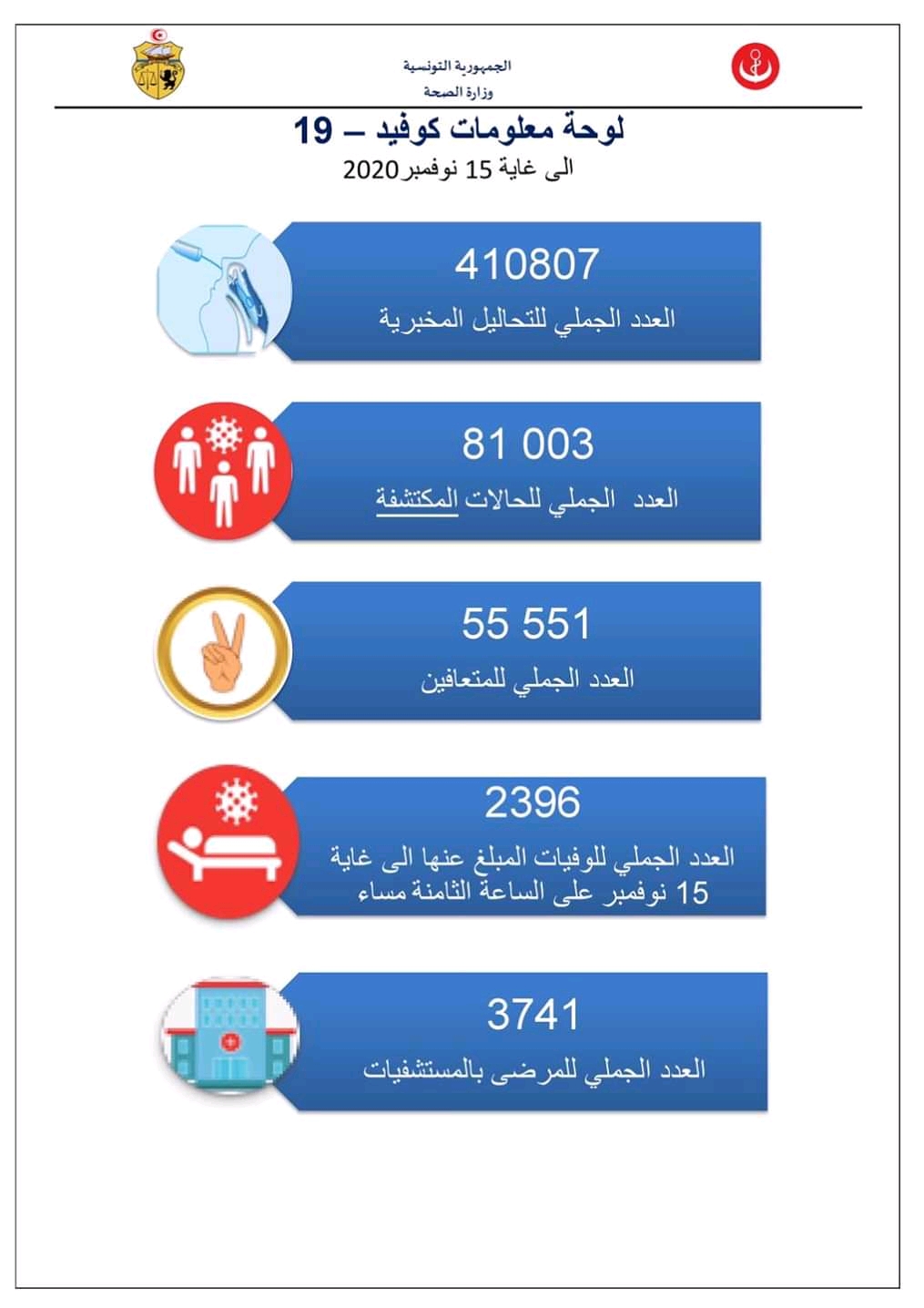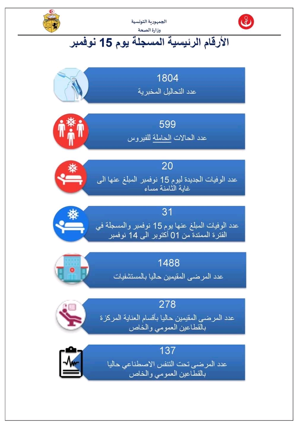 Tunisie-Tribune (Bilan du Covid-19 en Tunisie) – Le ministère de la Santé a annoncé, dans un communiqué publié aujourd’hui lundi 16 novembre, qu’à la date du 15 novembre 2020, 599 cas de coronavirus ont été enregistrés dans le pays.