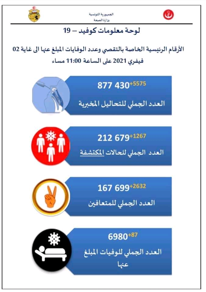 Tunisie-Tribune (Bilan du Covid-19 en Tunisie) – Le ministère de la Santé a annoncé, dans un communiqué publié ce mercredi 3 février 2021, qu’à la date du mardi 2 février, 1267 nouveaux cas de coronavirus ont été enregistrés dans le pays.