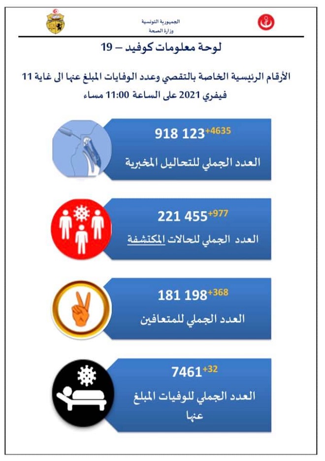 Tunisie-Tribune (Bilan du Coronavirus en Tunisie) – Le ministère de la santé a annoncé dans un communiqué, rendu public ce vendredi 12 février 2021, que 828 nouveaux cas de coronavirus ont été enregistrés à l’issue des 3914 tests de dépistage effectués le 10 février 2021.