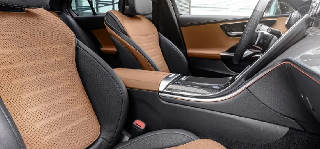 En revanche, la C met le paquet dans l’habitacle en copiant sa grande sœur de limousine. On trouve donc une planche de bord à l’agencement similaire avec, pour pièce maîtresse, une immense dalle tactile verticale légèrement orientée vers le conducteur. Le compteur numérique de 12,3 pouces et la tablette de 11,9 pouces sont prévus de série en France et raviront les technophiles en espérant que la manipulation de l’ensemble soit simple et la commande vocale maison efficace. Epuré, ce poste de conduite fait une telle chasse aux boutons que ces derniers ont trouvé refuge sur le volant, où ils sont tactiles, comme dans la S et la E. Et, tradition maison, les réglages des sièges en plus des commandes de vitres sont sur les contre-portes. Mercedes annonce aussi un détecteur d’empreinte digitale afin de vérifier quel conducteur s’installe à bord. Ainsi, celui-ci pourra retrouver ses réglages personnalisés : siège, préférences radio… ou sécuriser l’accès à ses mails. Une étape de plus dans la voiture connectée, mais qui soulève à nouveau la question de la confidentialité des données.