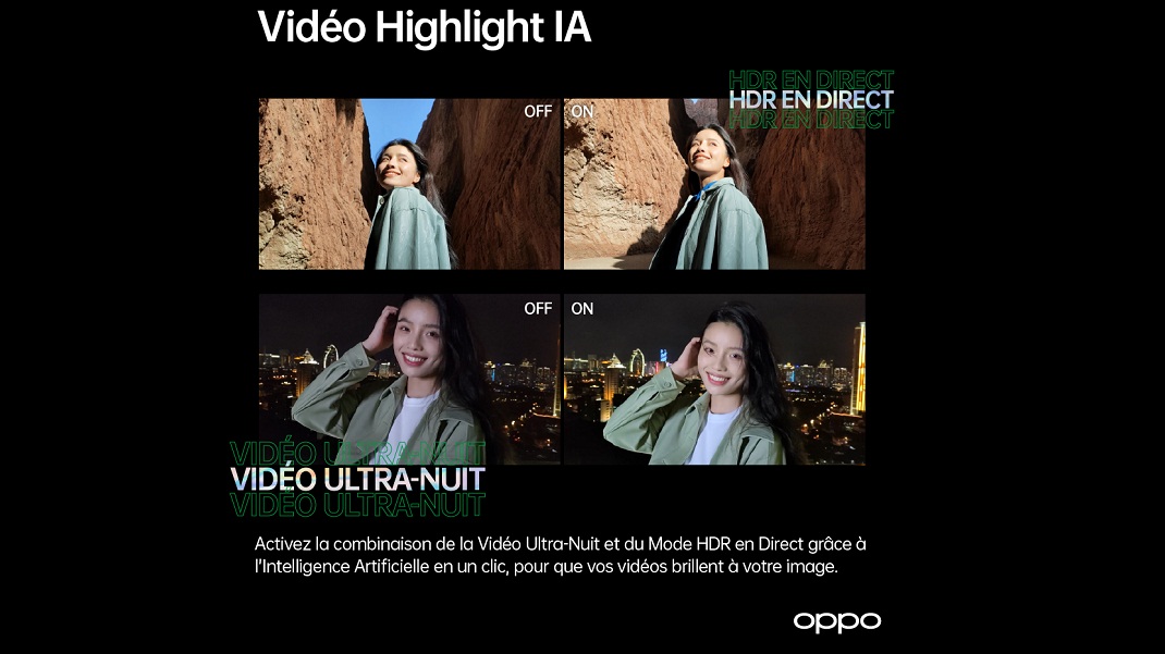Reno5 contient, en effet, deux options leaders dans l’industrie : le Portrait Mixte IA, premier effet double-vue vidéo pour smartphone et le Highlight Vidéo IA, qui permet, grâce à l’intelligence artificielle, l’amélioration de la luminosité. Avec les algorithmes de la Vidéo Ultra Nuit avancés et la technologie HDR en Direct, la qualité vidéo des scènes sombres ou rétro-éclairées est considérablement améliorée.