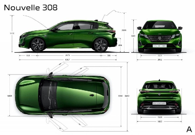 Développée sur une nouvelle version de la grande plateforme PSA, elle adopte un empattement plus long de 5,5 cm – à 2,675 m – que le modèle précédent, ce qui permet non seulement d’améliorer l’habitabilité aux places arrière, mais aussi aux stylistes de reculer l’implantation du pare-brise pour donner à cette nouvelle 308 un profil à capot long. Les Cx de 0,28 et SCx de 0,62 m2 annoncés par Peugeot sont très bons pour une berline compacte 5 portes ; autre nouveauté stylistique, le nouveau blason Peugeot ne figure pas seulement au centre de la calandre (subtilement concave), mais est aussi apposé sur les ailes avant, comme le fait Ferrari.