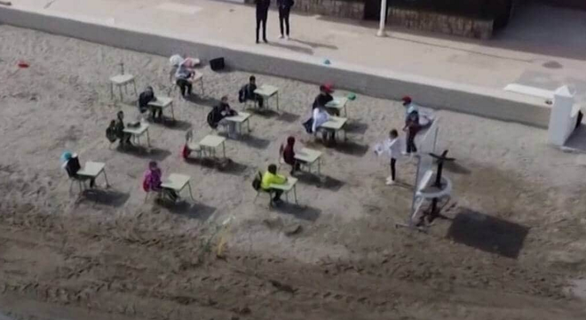 L’école Felix Rodriguez de la Fuente a installé des pupitres, tableaux et autres équipements sur la plage. Les élèves, âgés de 3 à 12 ans, suivent ainsi des sessions de cours de vingt minutes au bord de l’eau, comme on peut le voir sur une vidéo.