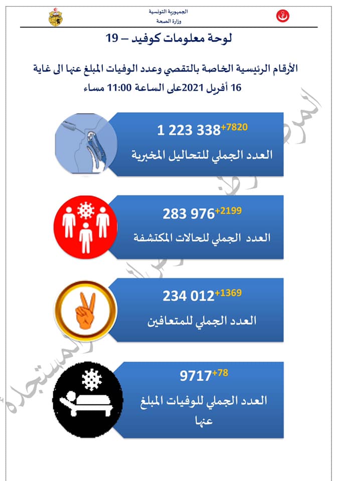 Bilan du Covid-19 en Tunisie (au 17 avril) : 78 décès et 2199 nouvelles contaminations portant le total à 283 976 cas