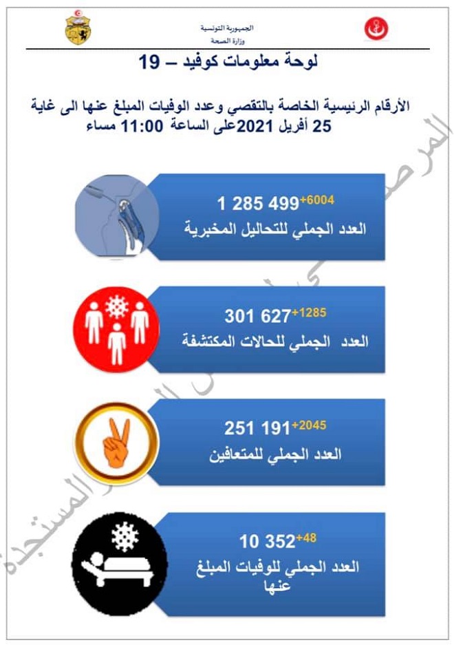Tunisie-Tribune ( Bilan du Covid-19) – Le ministère de la Santé vient d’annoncer que 61 nouveaux décès et 1285 contaminations par le virus Corona ont été recensés le 26 avril 2021.