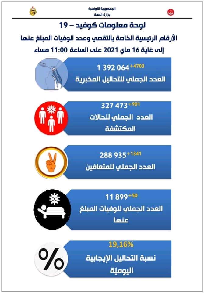 Tunisie-Tribune (Bilan du Coronavirus en Tunisie) – Le ministère de la santé a annoncé dans un communiqué, rendu public ce lundi 17 mai 2021, que 901 nouveaux cas de coronavirus ont été enregistrés à l’issue des 7703 tests de dépistage effectués le 16 mai 2021.
