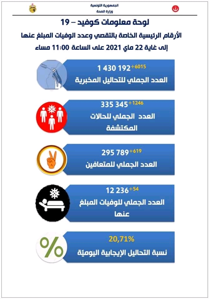 Bilan du Covid-19 en Tunisie (au 23 mai) : 54 décès et 1246 nouvelles contaminations portant le total à 334 099 cas