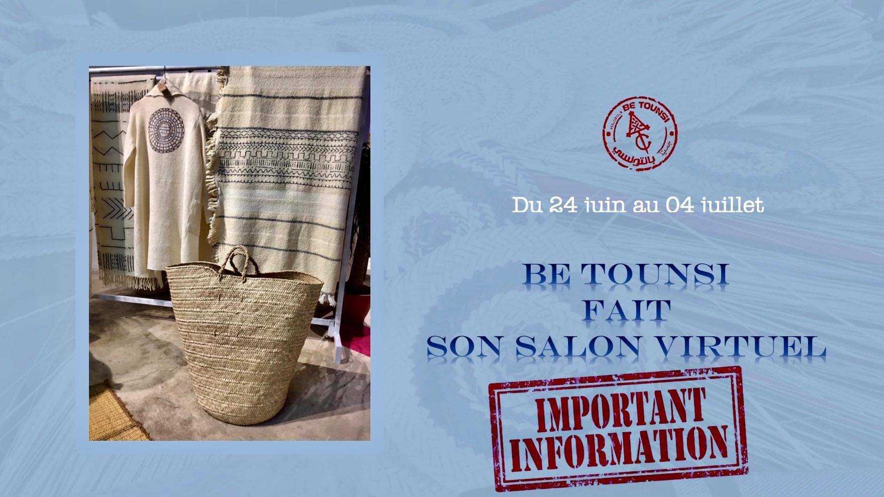 Tunisie Tribune (Salon de la création artisanale) – L’association Be Tounsi organise du 24 juin au 4 juillet 2021, une exposition artisanale virtuelle gratuite et ce, en soutien aux artisans et créateurs, qui devaient participer au Salon de la création artisanale.