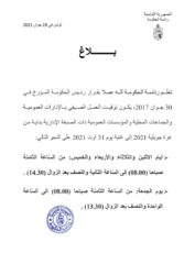 Tunisie Tribune (horaires administratifs d’été) – La présidence du gouvernement a annoncé, ce lundi 28 juin 2021, que l’horaire d’été dans les administrations publiques, les collectivités locales et les établissements publics à caractère administratif, du 1er juillet au 31 août 2021, est fixé comme suit :