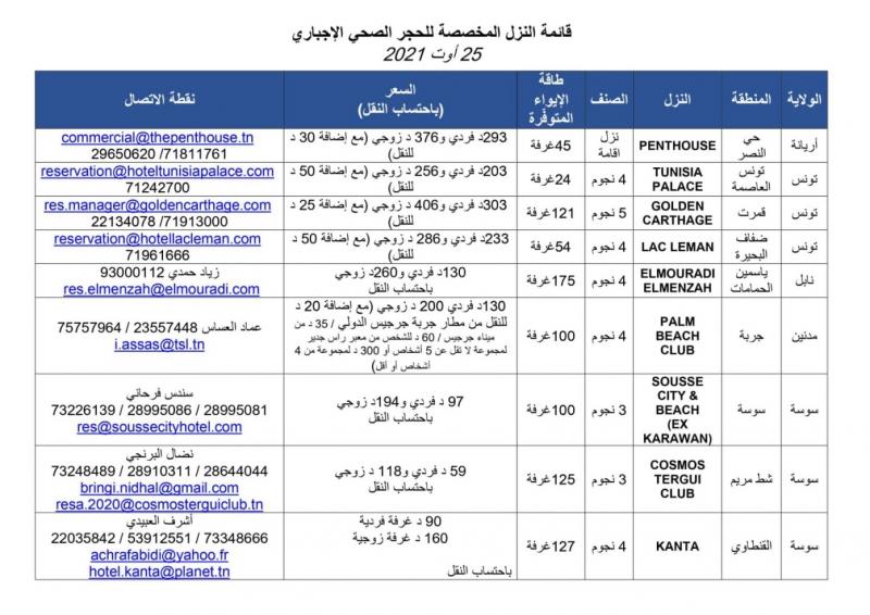 Tunisie Tribune (Confinement obligatoire) – Dans le cadre de la lutte contre la pandémie de covid-19, le ministère de la Santé a publié la liste des hôtels consacrés au confinement obligatoire imposé, à partir du mercredi 25 août, à tous les arrivants non ou partiellement vaccinés contre le coronavirus.