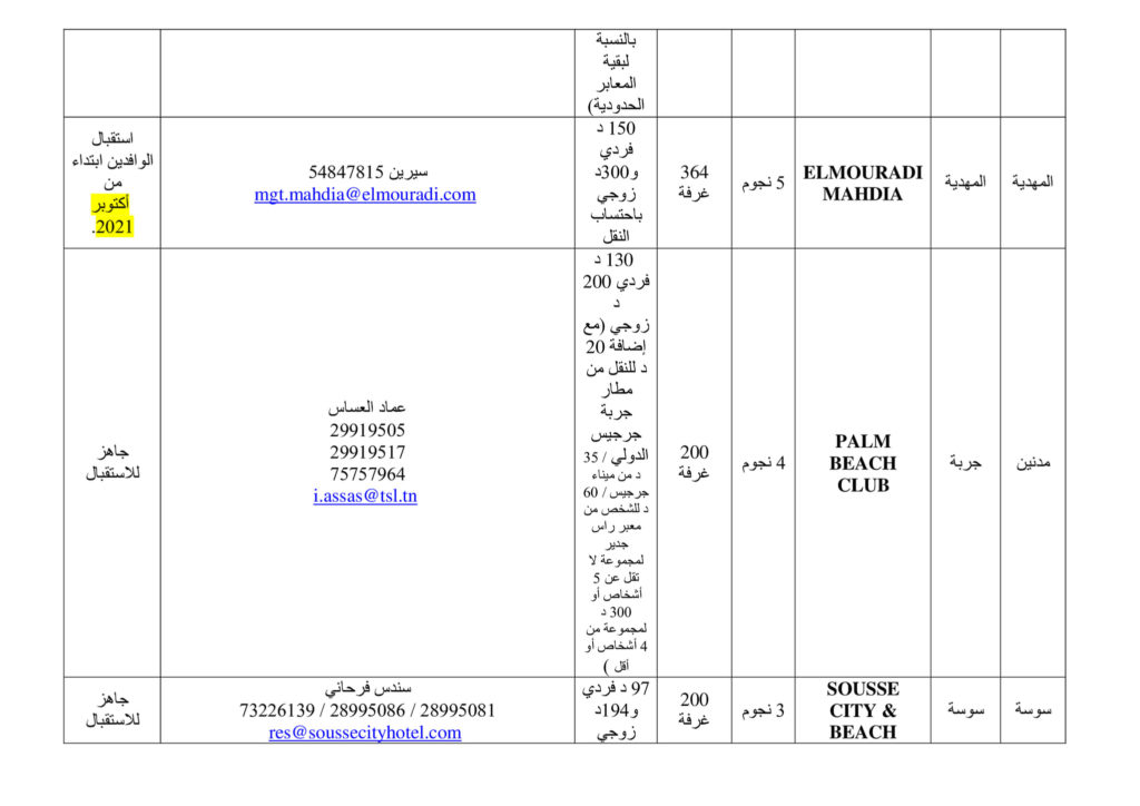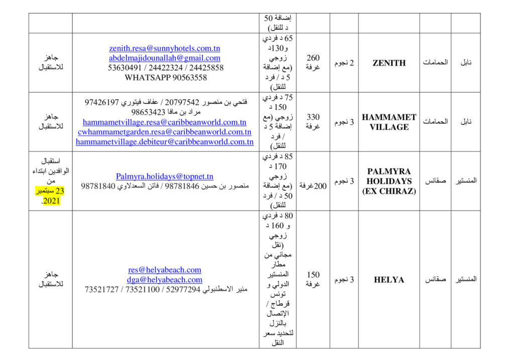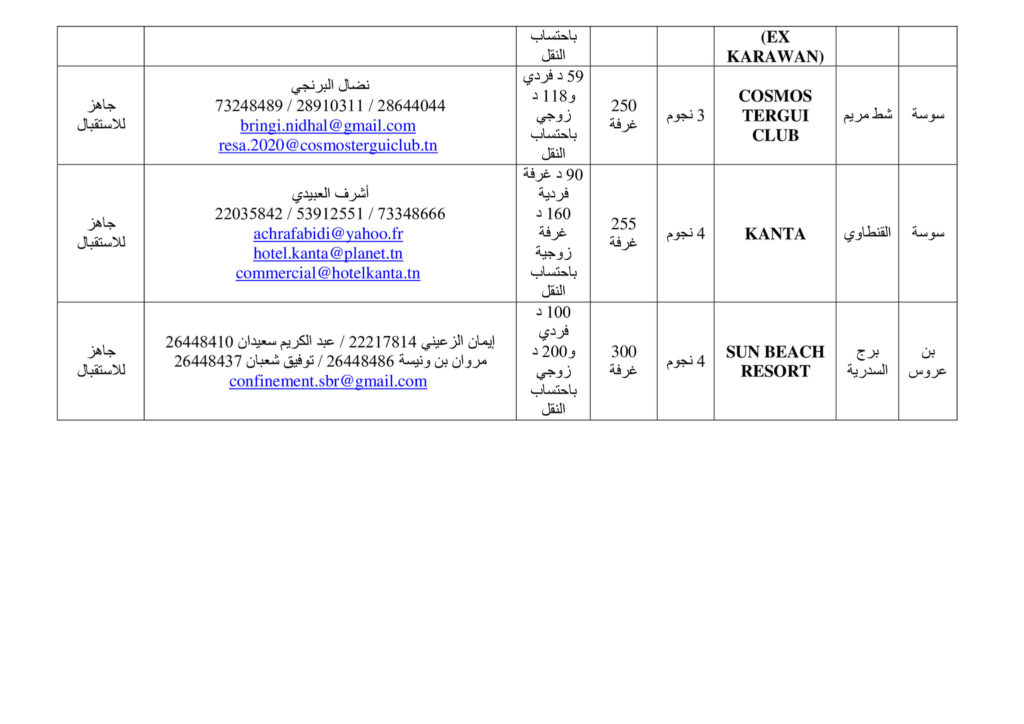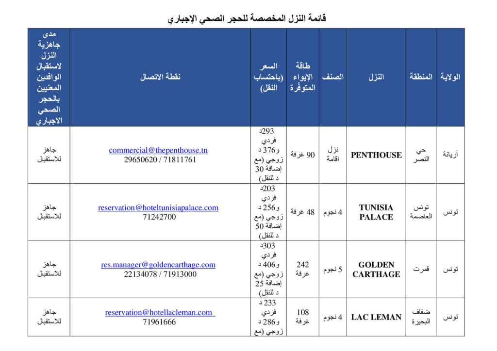 Tunisie Tribune (hôtels réservés à la quarantaine) – Le ministère de la Santé a publié jeudi, la liste des hôtels réservés à la quarantaine pour les personnes venant en Tunisie de l’étranger conformément aux nouvelles mesures en application à partir du 21 septembre :