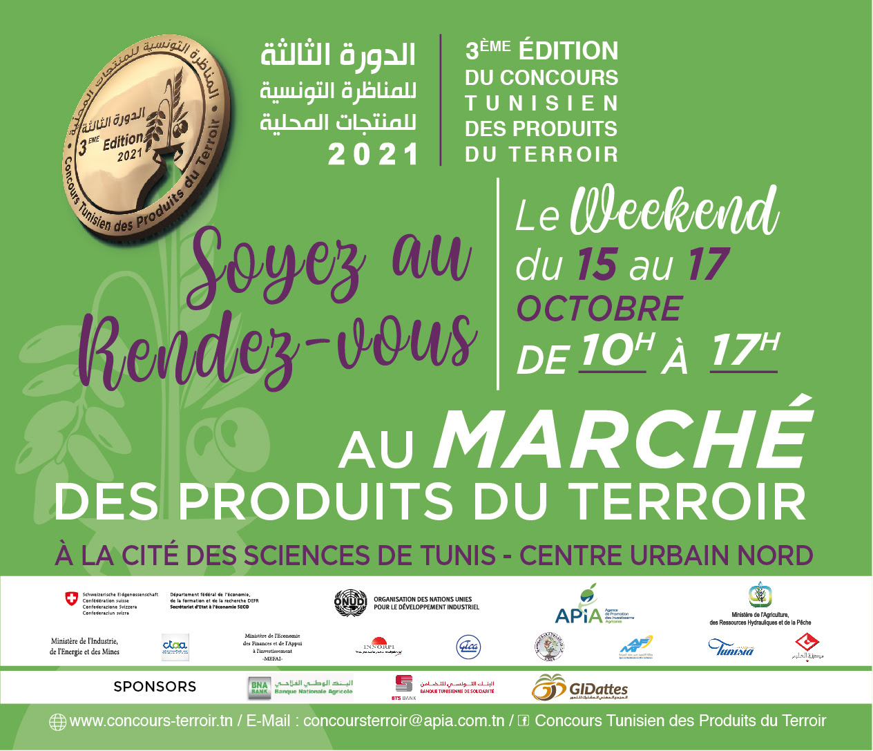Ces séances de dégustation ont eu lieu dans le cadre du Concours Tunisien des Produits du Terroir qui est organisé par l’Agence de Promotion des Investissements Agricoles (APIA), sous l’égide du ministère de l’Agriculture, en collaboration avec le ministère de l’Industrie, le ministère du Tourisme et de l’Artisanat, et avec l’appui du Projet d’Accès aux Marchés des Produits Agroalimentaires et de Terroir (PAMPAT 2) mis en œuvre par l’Organisation des Nations Unies pour le Développement Industriel et financé par le Secrétariat d’Etat à l’Economie de la Confédération Suisse (SECO).