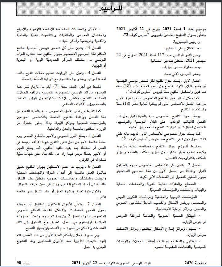 Tunisie Tribune (pass sanitaire) – Un décret présidentiel relatif au pass sanitaire contre le coronavirus a été publié, ce vendredi, dans le JORT.