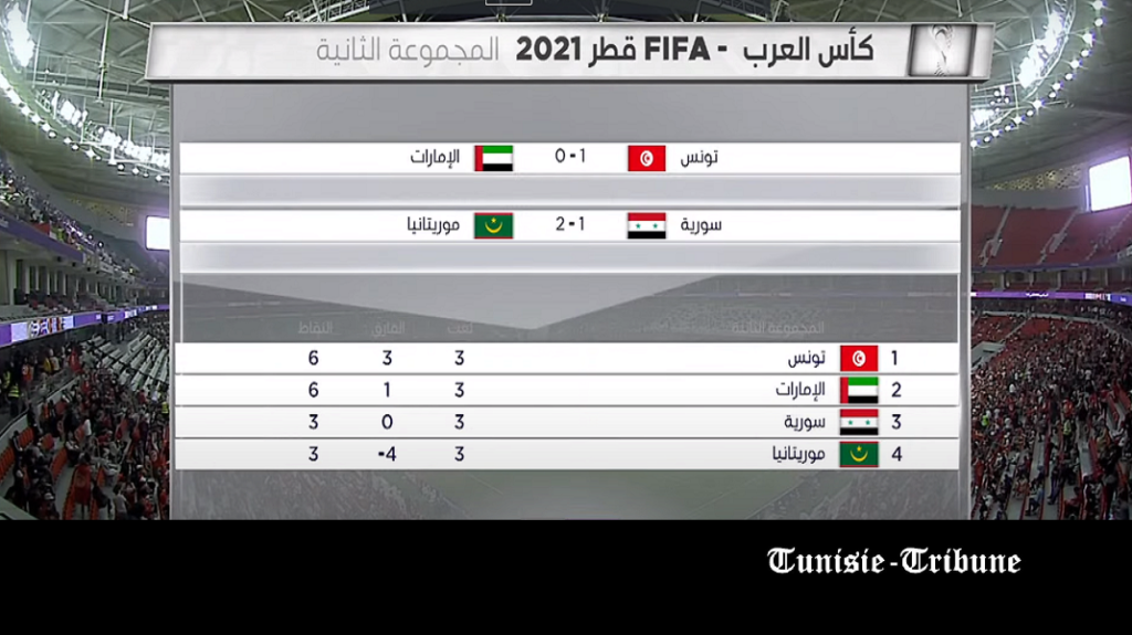 Classement : Tunisie 6 pts (+3, 6 buts marqués), Emirats Arabes Unis 6 pts (+1, 3 buts marqués), Syrie 3 pts (+0, 4 buts marqués), Mauritanie 3 pts (-4, 3 buts marqués)