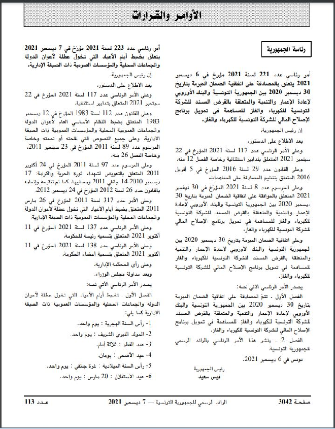 Tunisie Tribune (fête de la Révolution) – Le décret présidentiel n°2021-223 du 7 décembre 2021, fixant les jours fériés donnant lieu à congé au profit des personnes de l’Etat, des collectivités locales et des établissements publics à caractère administratif vient d’être publié au JORT.