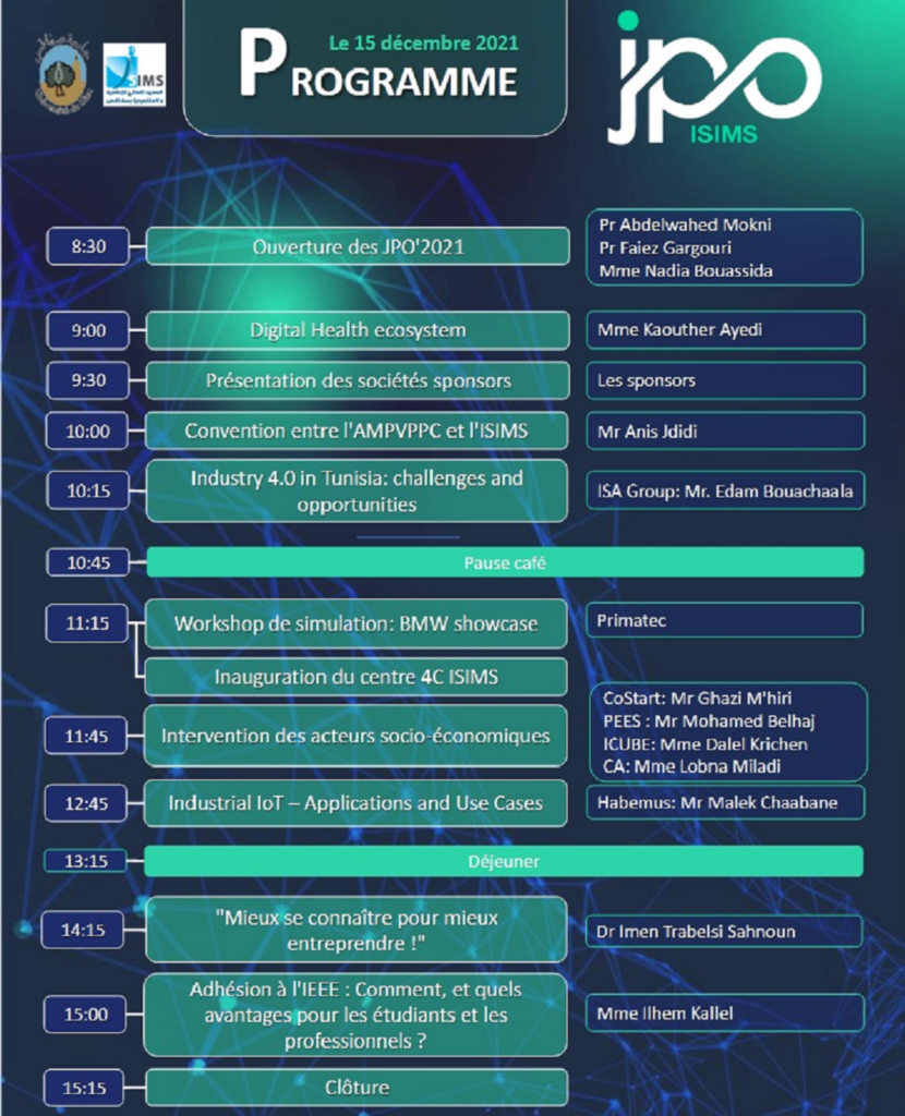 JPO-ISIMS est un rendez-vous annuel qui offre l’opportunité de présenter les différents parcours de la formation à l’Institut, et d’établir une plateforme de communication entre les étudiants et le monde professionnel. Ceci est dans la perspective de créer des coopérations durables, notamment à travers des programmes d’enseignement évolutifs adéquats aux besoins du marché de travail.