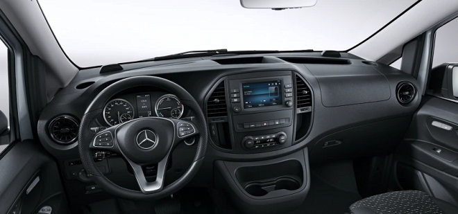 La récupération d’énergie est bien au programme sur cinq modes qui se commandent par les palettes au volant. De série, le Mercedes eVito hérite de l’écran tactile 7 pouces avec le système Audio 30, le Bluetooth avec Android Auto et Apple CarPlay, le détecteur de pluie ou encore l’allumage automatique des feux.
