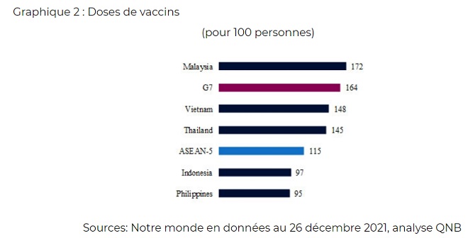 Après la découverte de vaccins efficaces à la fin de 2020, le rythme de la vaccination a été très rapide dans les économies avancées (AE), tandis que le déploiement des vaccins a été beaucoup plus lent en Asie. Cette situation, associée à une moindre marge de manœuvre des politiques monétaire et budgétaire pour stimuler leurs économies, a provoqué des effets négatifs sur la croissance économique des pays de l’ANASE-5 au cours de l’année 2021. L’Association des Nations de l’Asie du Sud-Est (ANASE-5) regroupe l’Indonésie, la Malaisie, la Thaïlande, les Philippines et le Vietnam, représentant les principales économies émergentes de l’Asie du Sud-Est.