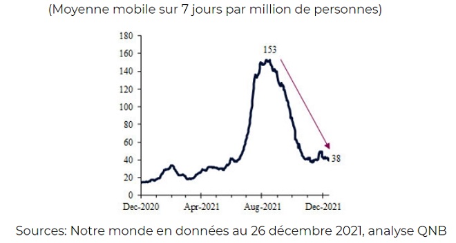 La survenue de la variante Delta a entraîné une forte augmentation des nouveaux cas de Covid-19 dans les pays de l’ANASE-5. Cette augmentation a toutefois contraint les pays de l’ANASE-5 à intensifier considérablement leurs campagnes de vaccination. Ces mesures, combinées à des mesures de confinement et de distanciation sociale, ont permis de réduire le nombre de nouveaux cas dans les pays de l’ANASE-5, qui est passé d’un pic de 153 par million d’habitants en août à moins de 40 aujourd’hui (graphique 1).
