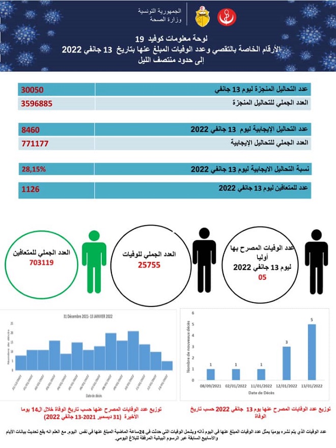 Tunisie Tribune (Coronavirus) – 8460 nouveaux cas de coronavirus et cinq décès ont été enregistrés le 13 janvier 2022, a annoncé le ministère de la Santé, ce vendredi.