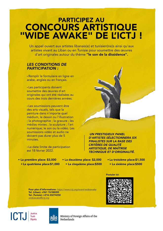 Tunisie Tribune (Wide Awake) – Le Centre International pour la Justice Transitionnelle (ICTJ) a le plaisir d’annoncer le concours artistique « Wide Awake », un appel ouvert aux artistes libanais(e)s et tunisien(e)s ainsi qu’aux artistes vivant au Liban ou en Tunisie pour explorer le thème « le son de la dissidence ». Le concours, qui est soutenu par le Ministère Néerlandais des Affaires Etrangères, présentera les œuvres de ceux qui documentent et mémorisent les histoires de leurs communautés en période d’instabilité, de résistance et de changement.
