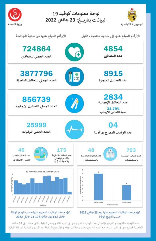Tunisie Tribune (Coronavirus) – 2834 nouveaux cas de coronavirus et quatre décès ont été enregistrés le 23 janvier 2022, a annoncé le ministère de la Santé, ce mardi.