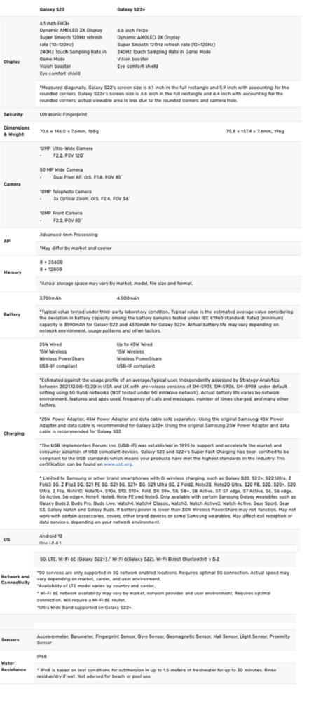 - Galaxy S22 et S22+ : Phantom Black, Phantom White, Green, Rose Gold dans les modèles 128 Go et 256 Go avec 8 Go de RAM
