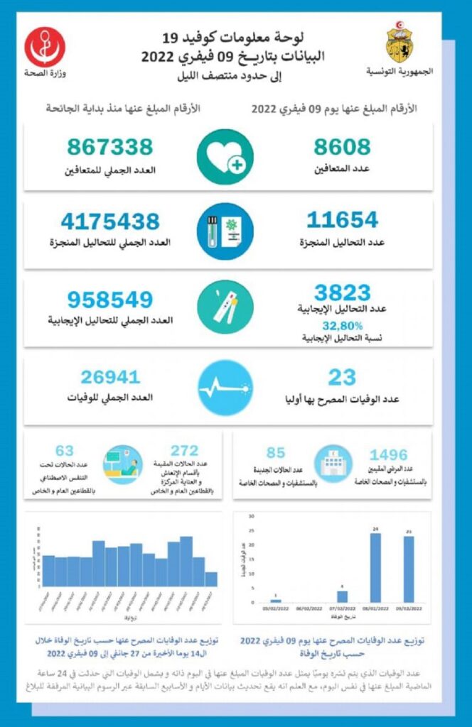 Tunisie Tribune (Bilan du Covid-19 en Tunisie) – Le ministère de la Santé a annoncé, sur sa page Facebook, que 23 décès dus au coronavirus ont été recensés, le 9 février 2022.