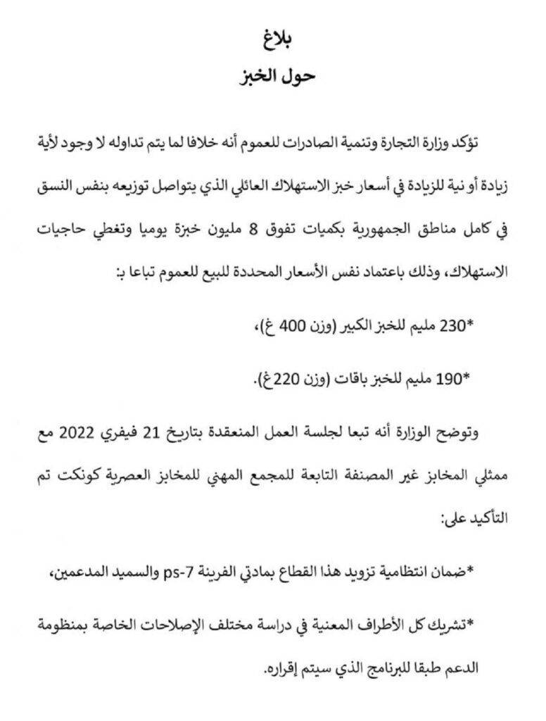 Le ministère a précisé que plus de huit millions de pains sont produits quotidiennement dans les quatre coins du pays. Selon le même communiqué, le pain est vendu à 230 millimes et la baguette à 190 millimes.
